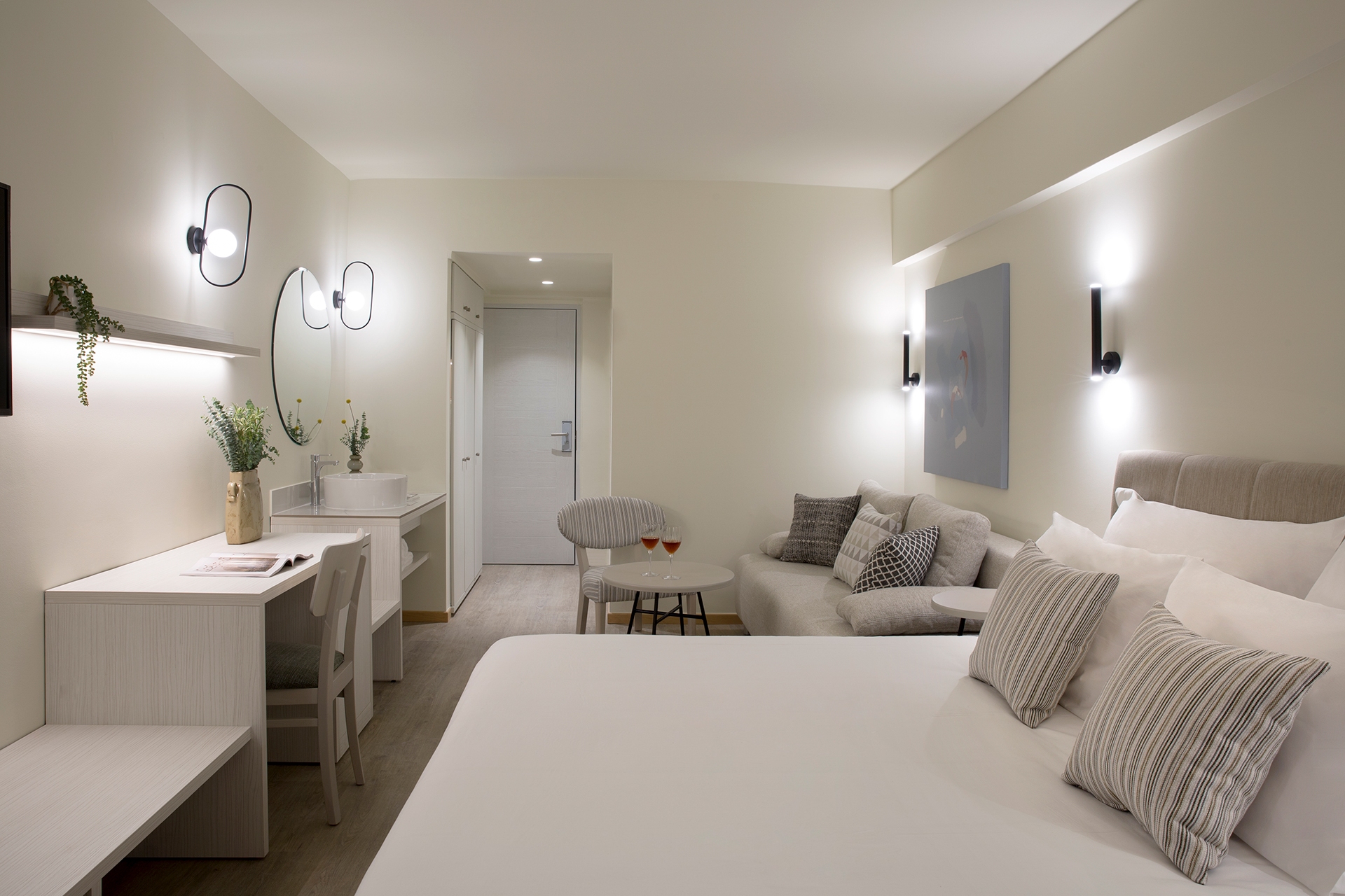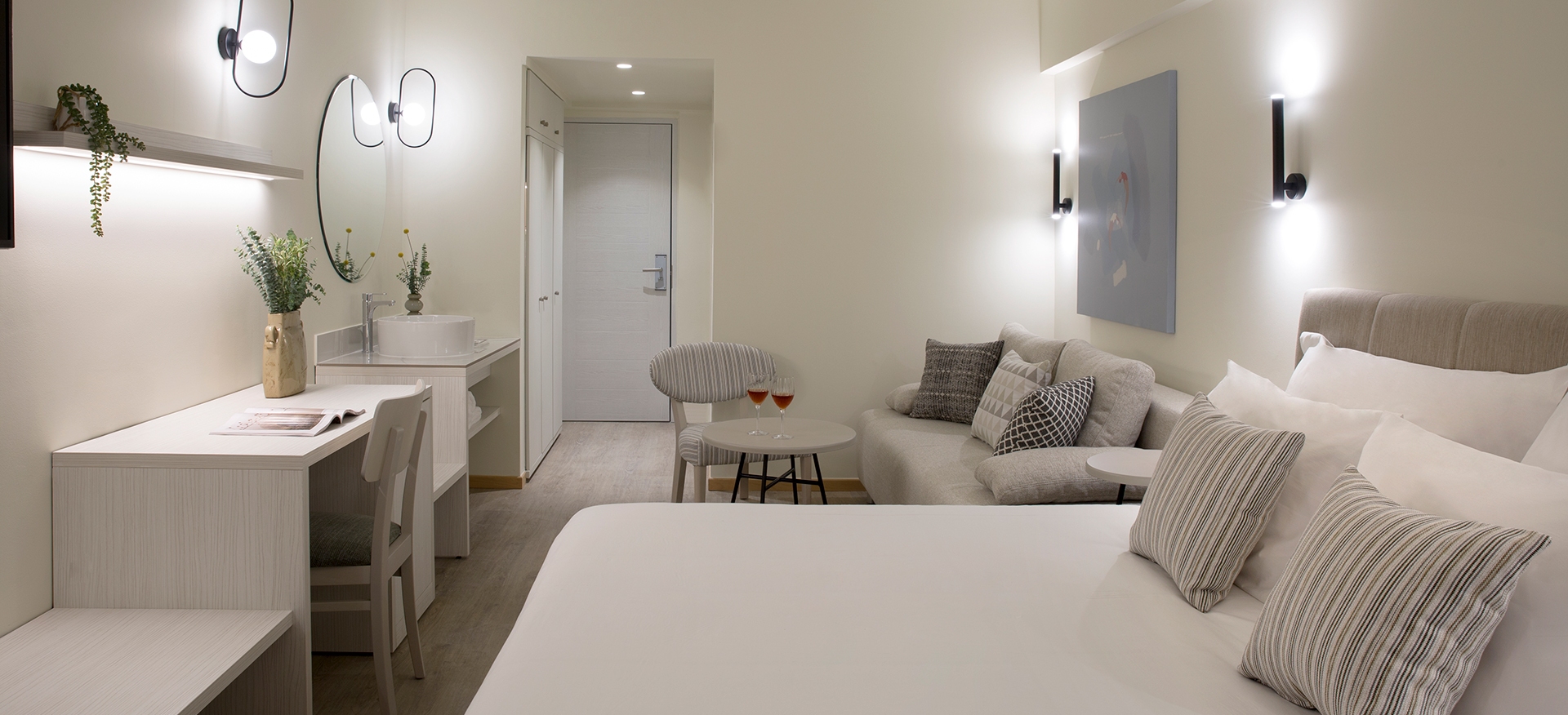 Find your inner tranquillity while gazing at the serene pool views from the exhilarating balcony. This stunningly attractive heaven praises the minimal aesthetics and the elegant luxury through the one-of-kind pieces and the unique decoration. It provides two relaxing singles or one double bed, a softy sofa-bed, and a sumptuous bathroom.